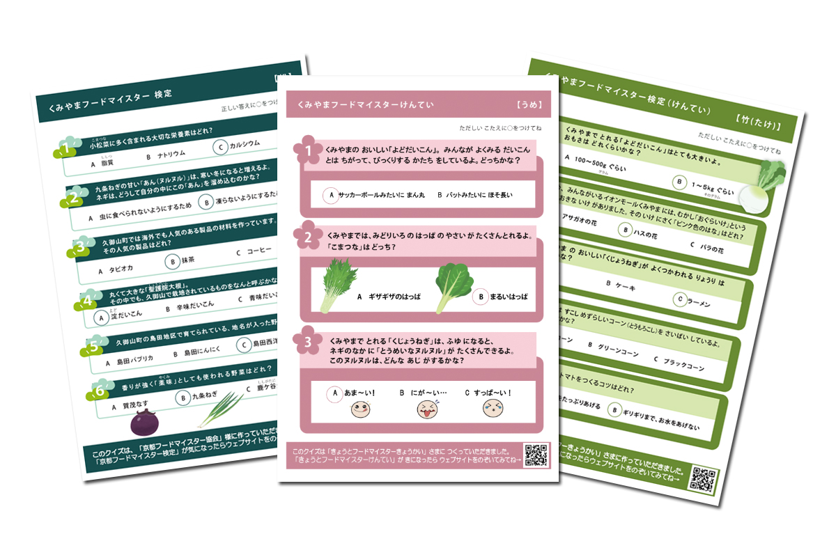 京都フードマイスター協会は、子どもたちが地域の野菜に親しみながら学べる企画として、「地域の野菜クイズ くみやまフードマイスター検定に挑戦!!」の問題作成に協力いたしました。